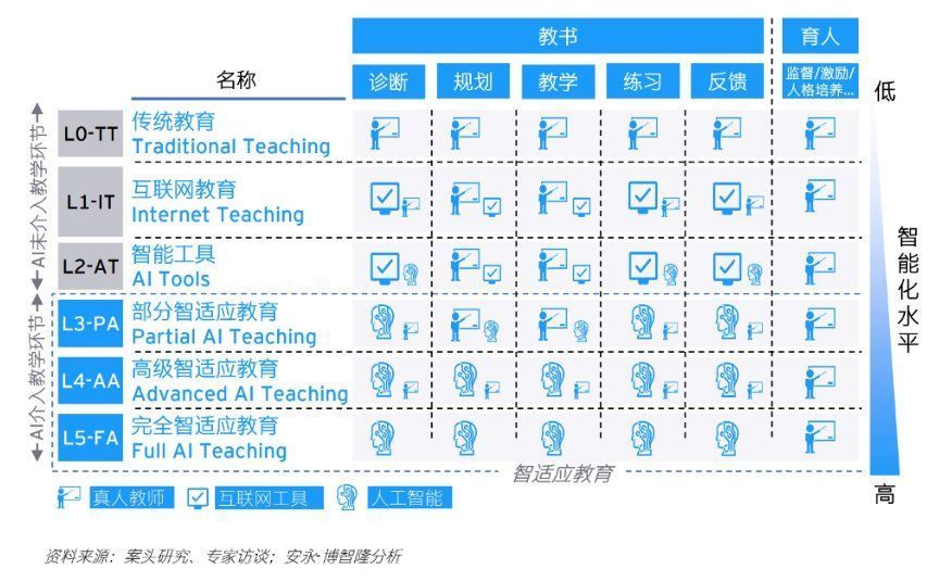 未来,随着庞大的知识图谱积累及AI算法演进,结合学生行为表现、教师优秀教案、学科内容积累等构建师生画像,AI将能够主导教学环节,老师将辅助进行监测、激励、培养等“育人”环节,完全智适应教育将成为教学理想形态。