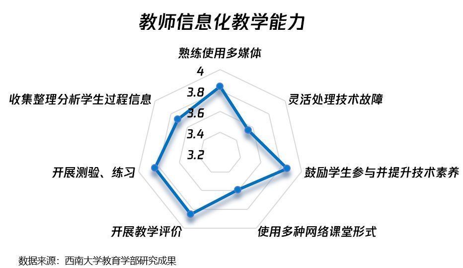 据西南大学教育学部对河南省初中教师国培班的一项研究显示[4],大部分教师的信息化能力处于中上水平,但更多局限于基础信息化工具的使用,灵活应用及处理突发情况的信息化教学能力较低,与借助科技手段促进学生个性化学习、培养学生核心素养的目标相差甚远。